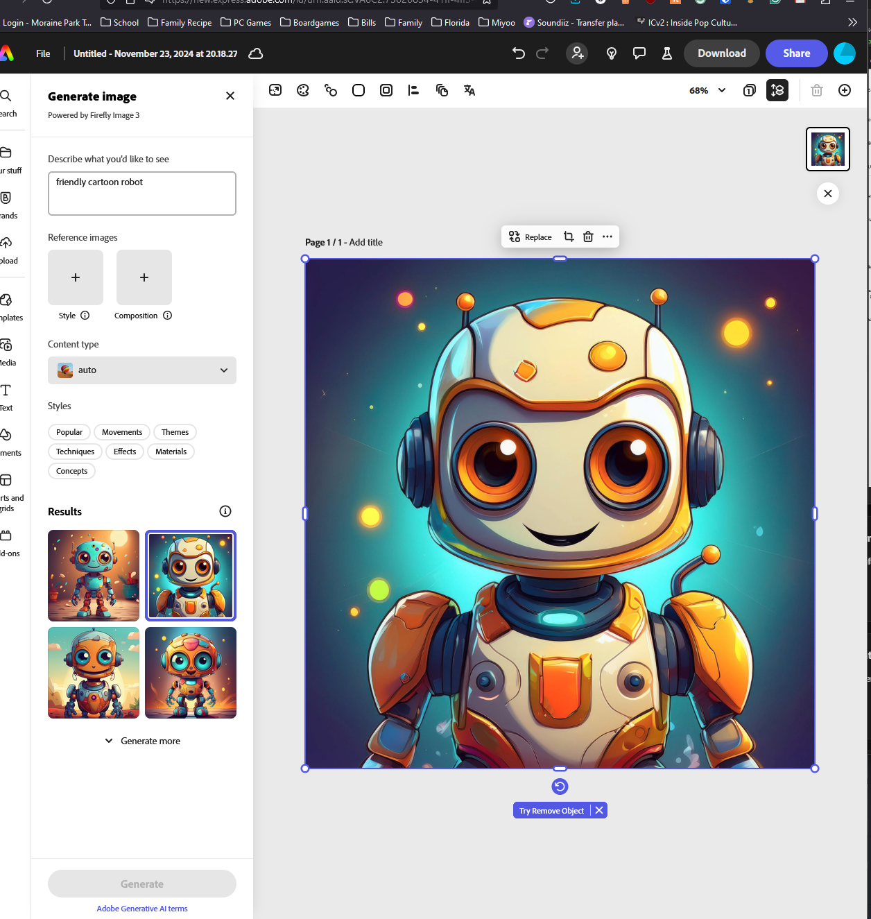 to generate the image. I entered "friendly cartoon robot" for the search parameters. It took about 10 to